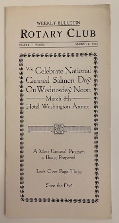 We are very fortunate to have extensive club archives dating to the early days of our club. There are some Rotary traditions we hold onto dearly, but I must say I'm kind of glad celebrating National Canned Salmon Day isn't one of them! I bet that was a “most unusual” meeting!