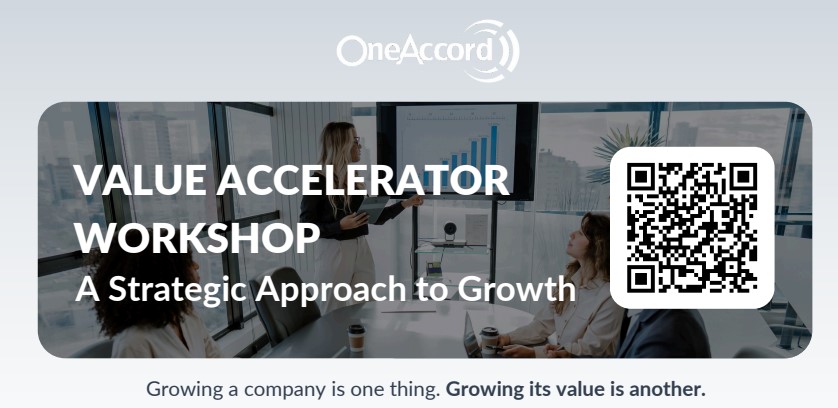 In addition, each participant will receive the following: • A copy of One Accords newest book: "Your Business Could Be Worth More" • A customized industry report to each participants industry with data and trends on pricing, revenues, marketing and much more.